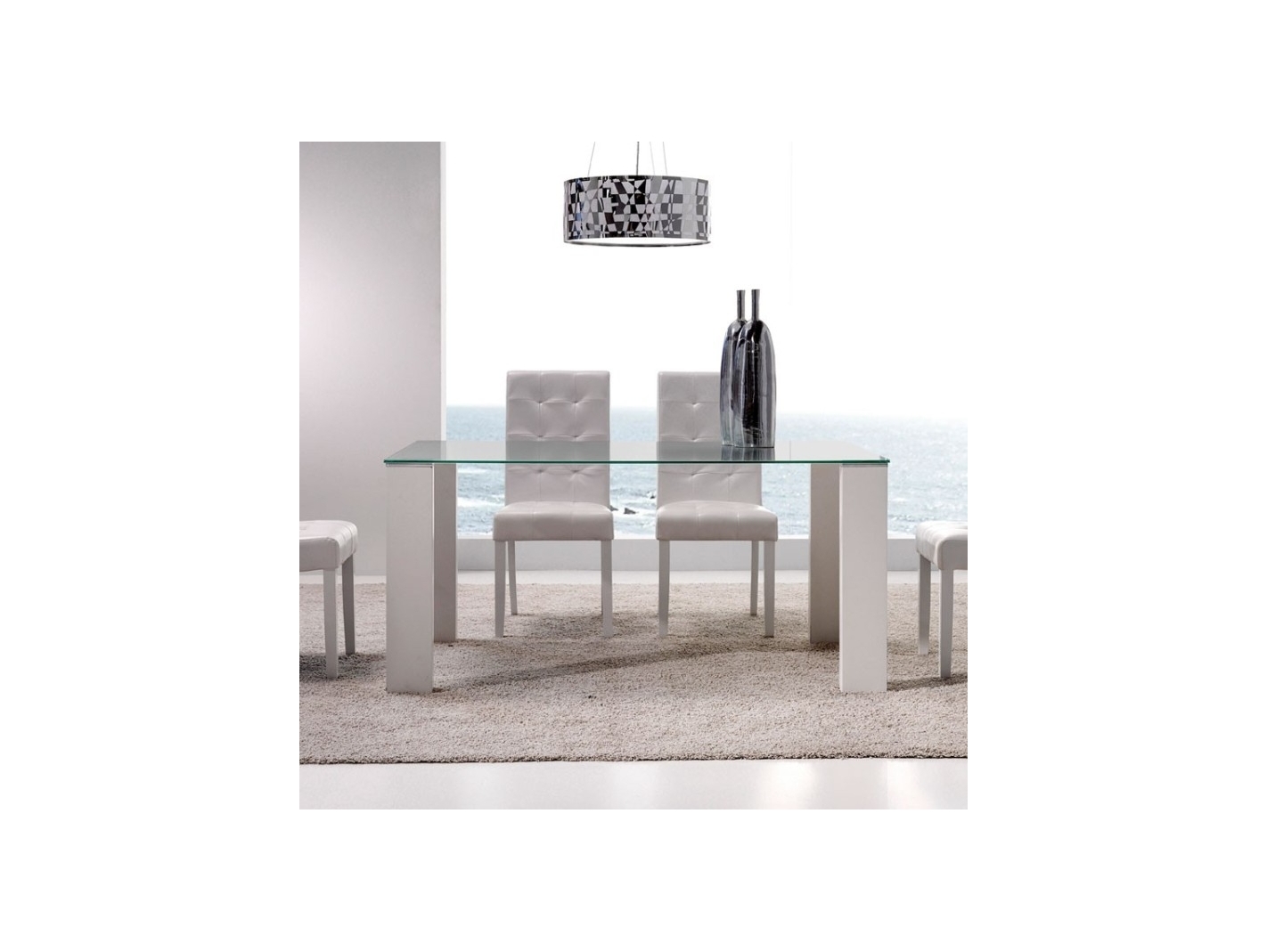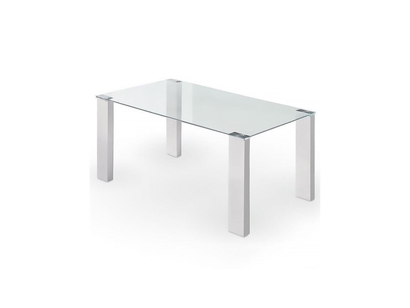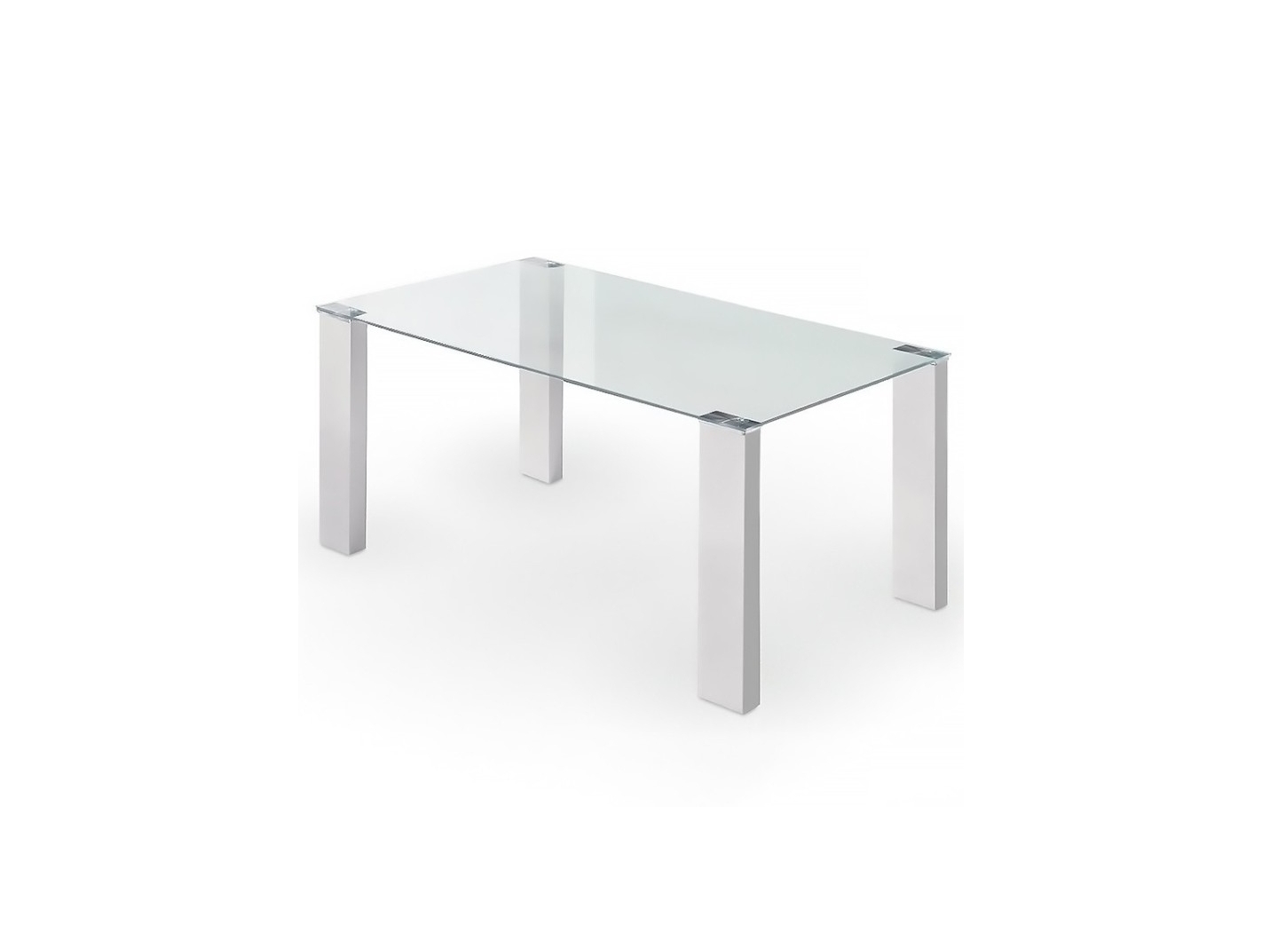 Mesa con patas de madera lacadas blancas y cristal transparente