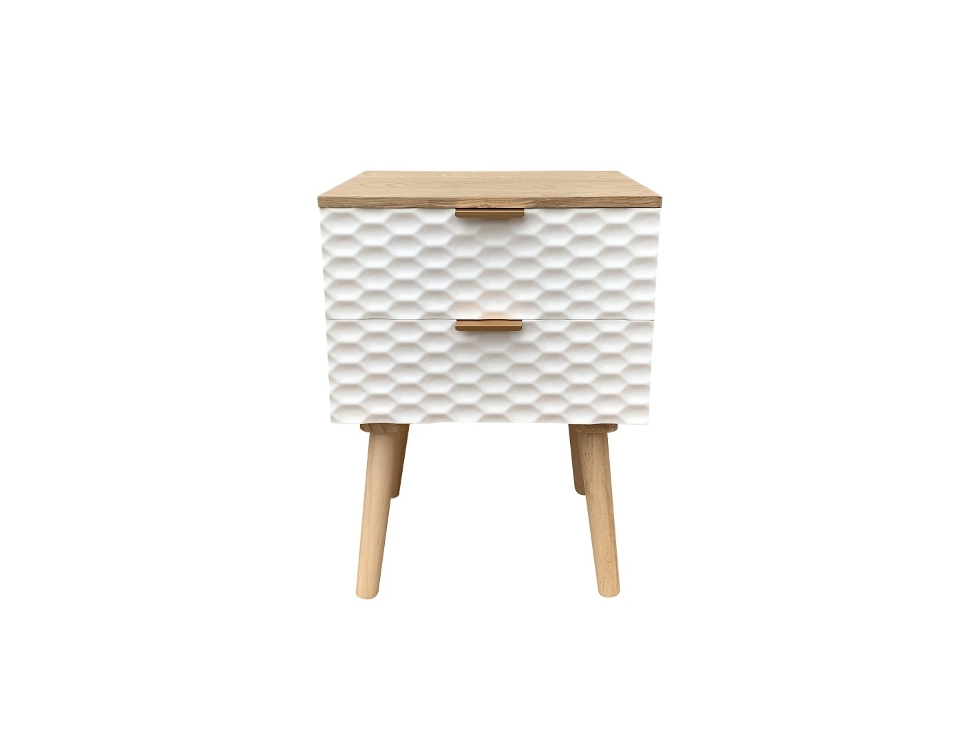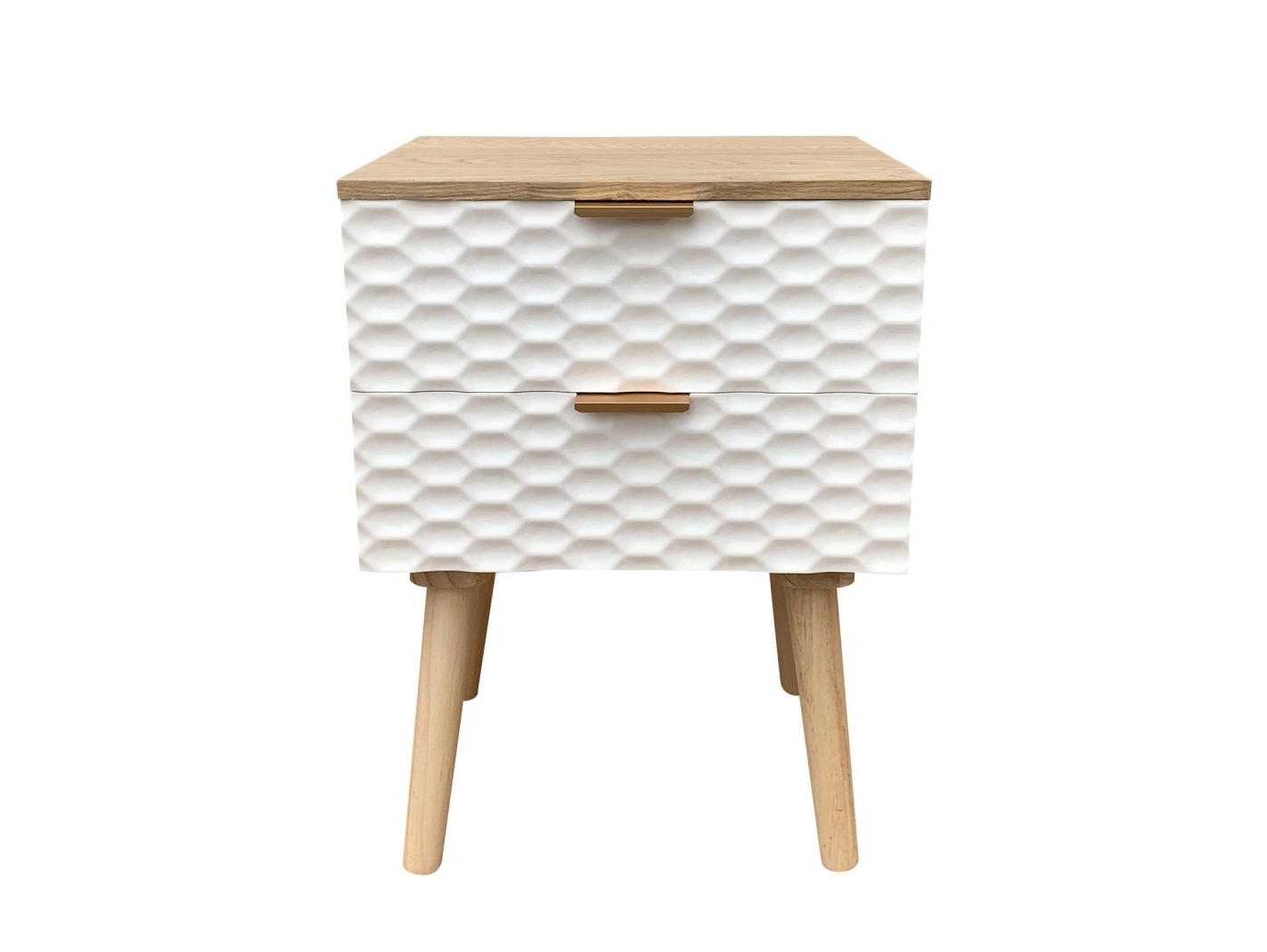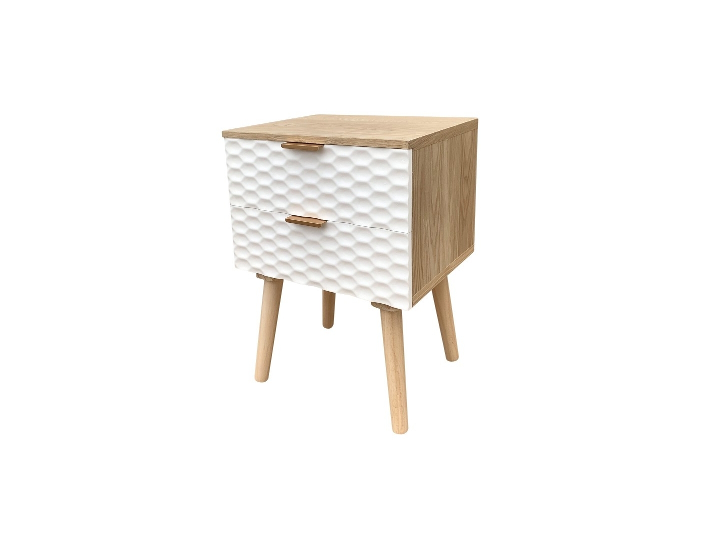 Mesita 2 cajones madera con frontal blanco geométrico y patas madera