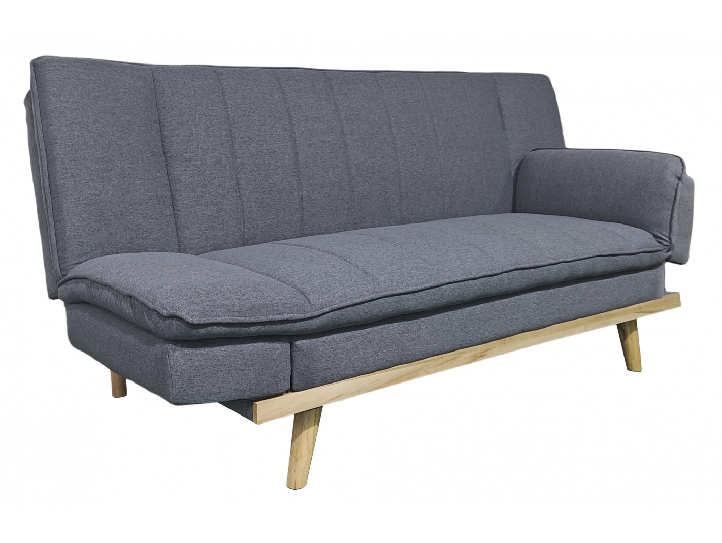 Sofá cama tapizado. Mecanismo clic clac con apertura tipo libro. Apoyabrazos reclinables y regulables en altura. Acolchado mullido soft confort. Costuras decorativas lineas verticales. Tejido gris. Base inferior y patas en madera maciza color natural. Medidas: 189 x 89 x 91 cm, cama 114 x 189 cm.