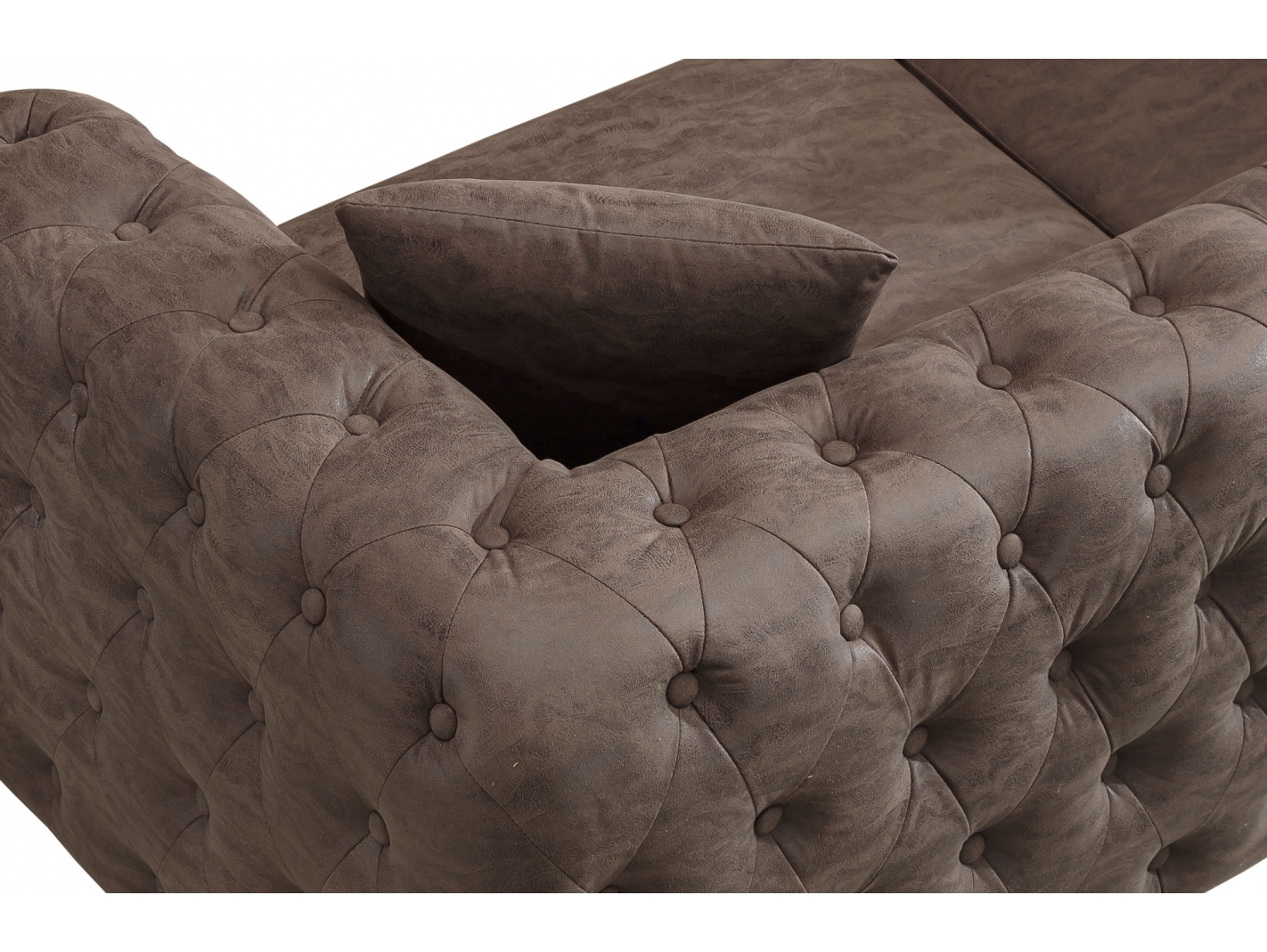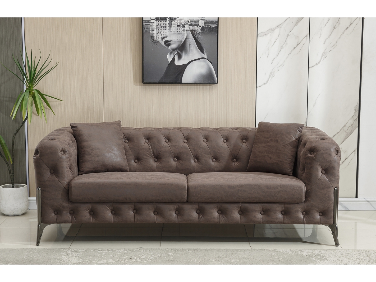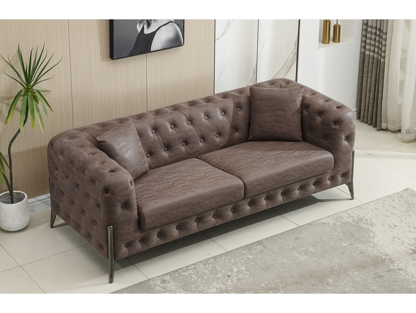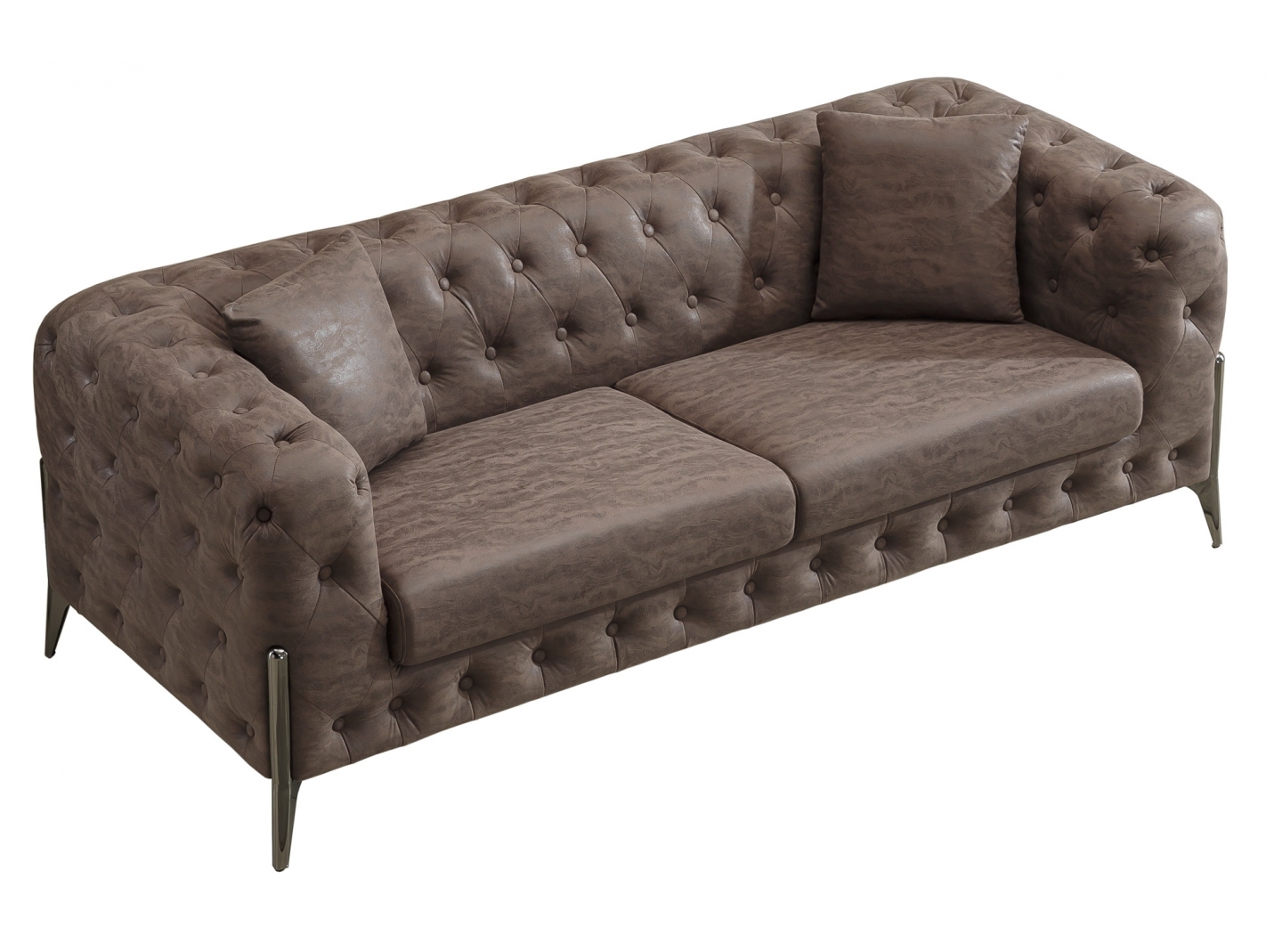 Sofa chester con botones tapizados. 3 plazas. Patas metálicas cromo oscurecido. Cojines de respaldo incluidos. Tejido chocolate vintage. Medidas: 202 x 85 x 72 cm.